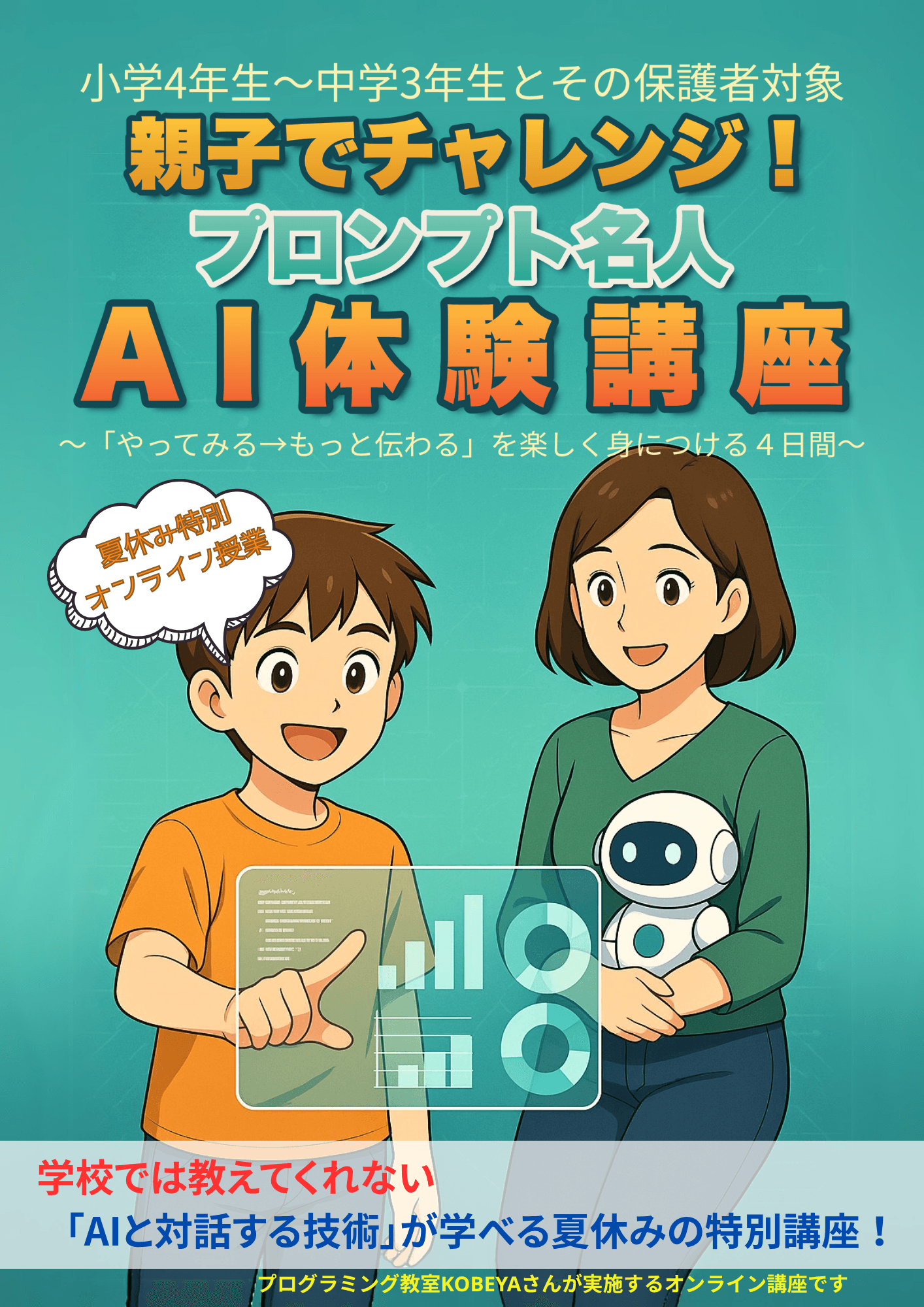 親子でチャレンジ!プロンプト名人 AI体験講座 2025 6/28 AI お知らせ セミナー 2025年6月28日8月にAIを体験するセミナーを開催します!詳しい案内をみてみる AI お知らせ セミナー よかったらシェアしてね! URLをコピーしました! URLをコピーしました! 小6でプロ検Level6、Python基礎ダブル合格!! セミナー 2030年~次期学習指導要領における「情報教育」 この記事を書いた人 school 関連記事 新法人設立のお知らせと、今後の取り組みについて 2026年1月7日 Typing ChallengeCup for University 2025(TCU2025)決勝大会 2025年8月4日 デジタネのマイクラッチタイピングがリニューアル! 2025年7月27日 プログラミング検定合格者(2025年6月) 2025年7月14日 こうすけ君のPython合格体験記 2025年7月14日 セミナー 2030年~次期学習指導要領における「情報教育」 2025年7月3日 小6でプロ検Level6、Python基礎ダブル合格!! 2025年6月23日 【保護者様向けプロ検セミナー】保護者様が学ぶプログラミングの基本 2025年4月30日